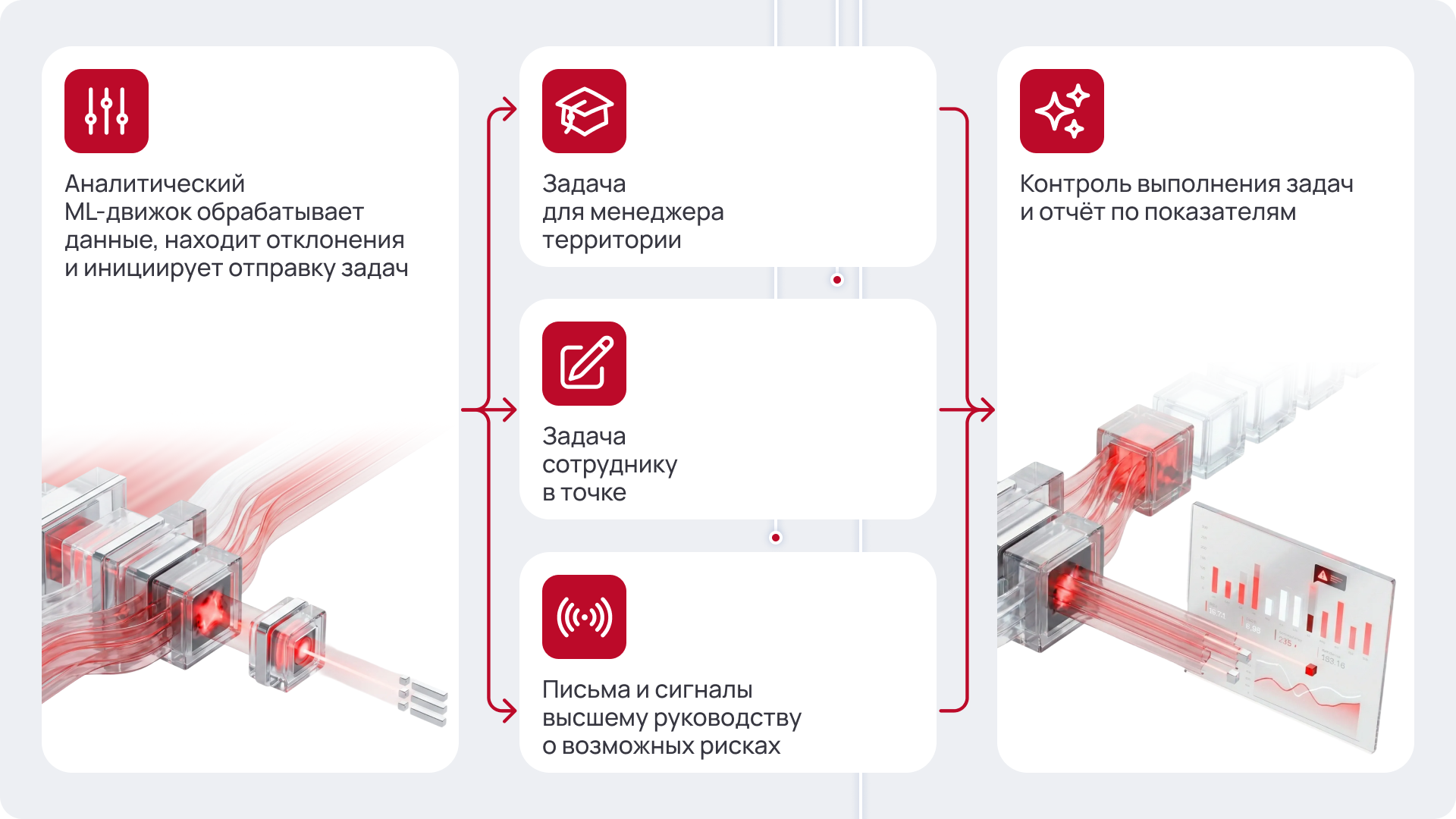 Для ритейлеров таким инструментом является Imredi Insight — продукт для управленческой аналитики, который собирает данные из разных источников, приводит их к единому стандарту и превращает в удобные дашборды с готовыми инсайтами для принятия решений. Ключевое преимущество в такой системе — автоматическая отправка подсказок и задач в точки продаж через мобильное приложение. Корректирующие действия на местах позволят предотвратить возникновение потерь, либо быстро исправить ситуацию, если проблема все-таки случилась. Система регулярно направляет сигналы и контролирует своевременное исполнение заданий.