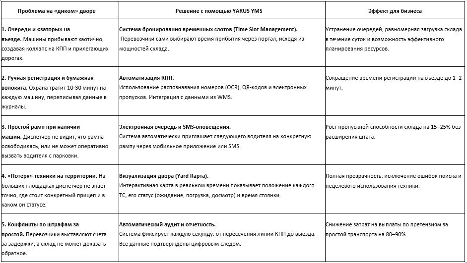 Многие пытаются внедрять Yard Management как отдельное решение, но настоящий профит компания получает только при «бесшовной» связке со складской системой. Когда WMS и YMS работают как единый организм, склад получает: