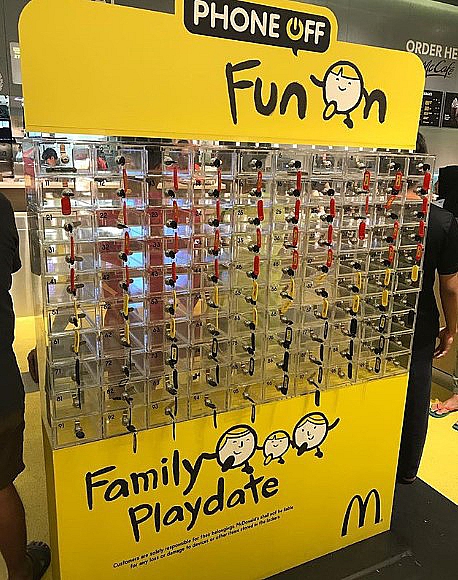 "Макдоналдс" выступает за живое общение своих гостей. Чтобы мотивировать посетителей ресторана быстрого питания общаться в реальном мире, "Макдоналдс" предоставил специальный шкаф с сотней маленьких камер хранения для гаджетов. Новый элемент интерьера ресторана пришелся по вкусу и детям, и взрослым.