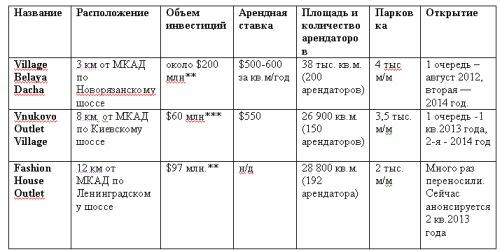 Тем не менее, девелоперы оказались смелее теоретиков, и в августе в Подмосковье открылся первый представитель формата — Outlet Village Белая Дача. В самое ближайшее время в Москве рядом с аэропортом «Внуково» откроется Vnukovo Outlet Village, а в середине 2013 года девелоперы обещают открыть Fashion House Outlet рядом с аэропортом «Шереметьево».