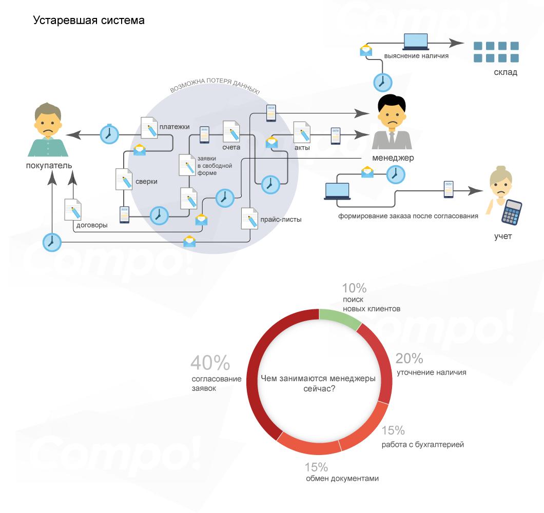 — Большинство участников оптового рынка работают по схеме "менеджер — прайс-лист —телефон — почта — клиент". По полученному по почте от менеджера прайса клиент формирует заказ, отправляет обратно менеджеру, тот вручную сверяет с наличием на складе, рассчитывает итоговые цены и вновь отправляет информацию (уже актуальную) клиенту. Начинается повторное согласование, звонки, подбор аналогов того, чего не оказалось в наличии и прочее. На один заказ, от формирования заявки до выставления счета, может уходить до двух дней, а в некоторых случаях ситуация еще хуже. Цель автоматизации — добиться того, чтобы B2B-система являлась эффективным посредником между клиентом компании-заказчика и его учетной системой. Работа менеджера должна сводиться к сопровождению сделок и рекламаций, а не к поиску товара, уточнению его наличия, звонкам, выставлению счетов и другим вторичным действиям. Клиент изначально должен видеть только актуальную информацию по номенклатуре и ценам, сформированным, в соответствии со своим статусом. У него должна быть возможность управлять юридическими лицами и делегировать доступ сотрудникам.