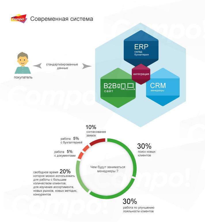 B2B-система позволяет многократно уменьшить время на формирование заказов и запуска заказа на отгрузку или производство, сделать более прозрачным и удобным для клиента подбор нужной номенклатуры. Время, затраченное на продажу единицы товара в старой системе, гораздо больше времени, затраченного на отгрузку фуры этих товаров. Ускорение торговли — это всегда увеличение оборотов и снижение издержек.